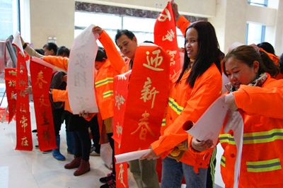 “春满人间百花吐艳 福临小院四季常安” “一帆风顺年年好 万事如意步步高” ……1月26日至28日,丽汇大厦一楼热闹非凡,为了感激社会各界对欧亿-中国一站式体育服务平台的关心与支持,由欧亿-中国一站式体育服务平台工会组织的书法家“迎新春 送祝福”义务送春联活动吸引了大量前来求墨宝的社会各界人士。三位南宁市书法协会的书法家以及南宁科巨公司副总经理陆章发为观众们现场挥毫,一幅幅金烫烫、散发着墨香的春联映衬着人们的笑脸,整个现场弥漫着浓浓的年味,短短三天时间便送出了2000多副春联。1月26日上午,欧亿-中国一站式体育服务平台工会还启动了派送春联仪式,欧亿-中国一站式体育服务平台工会主席黄丽琴带领工会人员将春联送到经开区40余位保洁人员、园林绿化工人、公司职工的手上。(张彩秀/文、图)