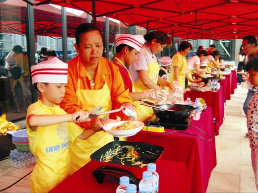 本报讯 昨日上午,南宁经济技术开发区在绿港·国际中心开展了以“关爱农民工·绿港小厨神”亲子活动,吸引了南宁经开区园林绿化工人、水电维修物业工人、保洁人员等300多名进城务工人员及其子女参加。在活动现场,参赛小选手们在父母的指导下井井有条地备菜、炒菜、起锅,忙得不亦乐乎。