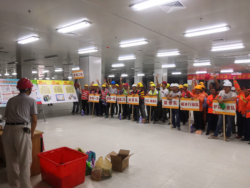 影片播放结束后,紧接着开展的是安全生产知识竞赛活动。参与竞赛的人员根据不同工种、不同部门分成9支队伍。竞赛内容包括安全生产法律法规、应急救援、消防、减灾防灾、劳动保护等多方面知识,竞赛形式为举手抢答。竞赛过程中,9支代表队你追我赶,毫不示弱,战况十分激烈。选手们的活跃表现不时引来阵阵掌声和欢笑声,即使中途突发工地停电状况,也未能浇灭大家的热情,比赛在高涨的气氛中继续进行。此次竞赛以寓教于乐的形式对管理人员和一线施工人员进行安全知识普及,除进一步提高其安全防范意识和应对事故的处理能力,还丰富了大家的业余文化生活,为有效防止安全事故的发生提供了有利保障。