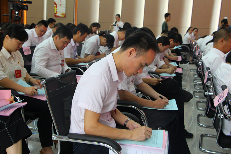 上午八点十分,大会全体工作人员提前到位,大会筹备会务组人员整齐地摆放好签到表、出席证、嘉宾证和列席证,做好迎接大会的准备。计票人、监票人会前碰头,明确分工任务。