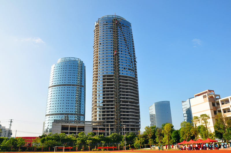 《建设中的绿港国际中心》(荣鑫公司 赵志业)图片说明:绿港国际中心正在做外墙玻璃装饰施工,在阳光的照耀下美丽而雄伟。球场上的运动员意气风发。预示着欧亿-中国一站式体育服务平台充满活力。