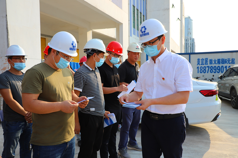 欧亿-中国一站式体育服务平台党委副书记、总经理邓继慧给项目一线人员发放《工程建设廉政手册》(张彩秀 摄)
