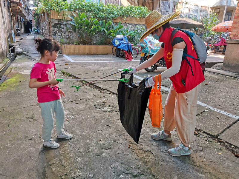 虽然他们年纪小,但是创城志愿服务的热情却十分高昂。李悦歌小朋友早上一到工作地点就迫不及待地去找工具,一直问妈妈我们能做什么,我们要做什么,甚至连早餐都顾不上吃。一个上午她跟随着妈妈,对槎路社区的小广场进行了打扫,清理了球场维修时打碎的玻璃渣子和积水区。随后,她又跟随着妈妈进入到小区里,捡拾居民丢弃在外面的垃圾。一开始由于个子比较小,拿的夹子有点长,她控制不好,怎么夹都夹不住那个小小的烟头,经过她反复实验终于掌握了力道,知道夹子靠下面的部分比较好控制,容易把物品夹起来。在掌握了窍门以后,她开启了疯狂“寻宝”的过程。她就像发现宝藏一样去发现丢弃在树叶、花圃带、水沟里面的烟头,甚至比志愿者姐姐和阿姨们发现的还快,每当她捡拾到烟头,她都特别的兴奋。志愿者阿姨们也从草丛里将垃圾捡拾出来,让她负责把烟头和垃圾放到黑色的垃圾袋里。