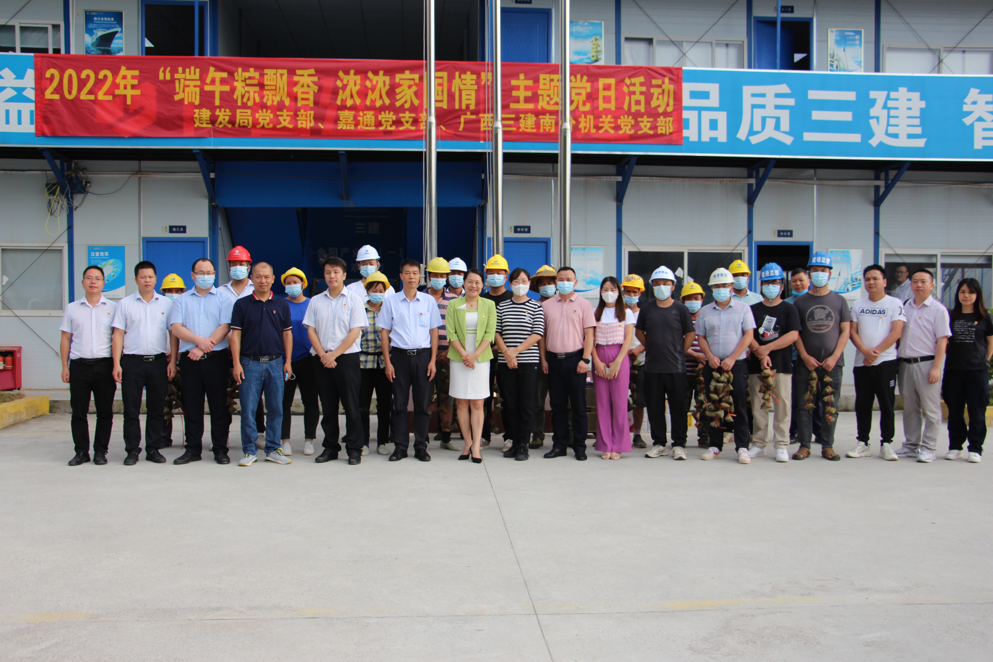 荷月繁花似锦来,粽米飘香温情至。端午佳节将至,为进一步传承中华民族传统文化,深入挖掘端午节的文化内涵,增强文化自信,弘扬新时代爱国主义精神,涵养广大党员的家国情怀,6月1日,嘉通公司党支部联合经开区建设发展局党支部、广西三建南分机关党支部深入绿港•金阳产业城项目开展2022年“端午粽飘香 浓浓家国情”主题党日活动,为项目一线工人送去粽子等慰问品以及节日问候。欧亿-中国一站式体育服务平台党委委员、副总经理、嘉通党支部书记黄丽琴以及嘉通公司党支部全体党员参加活动。
