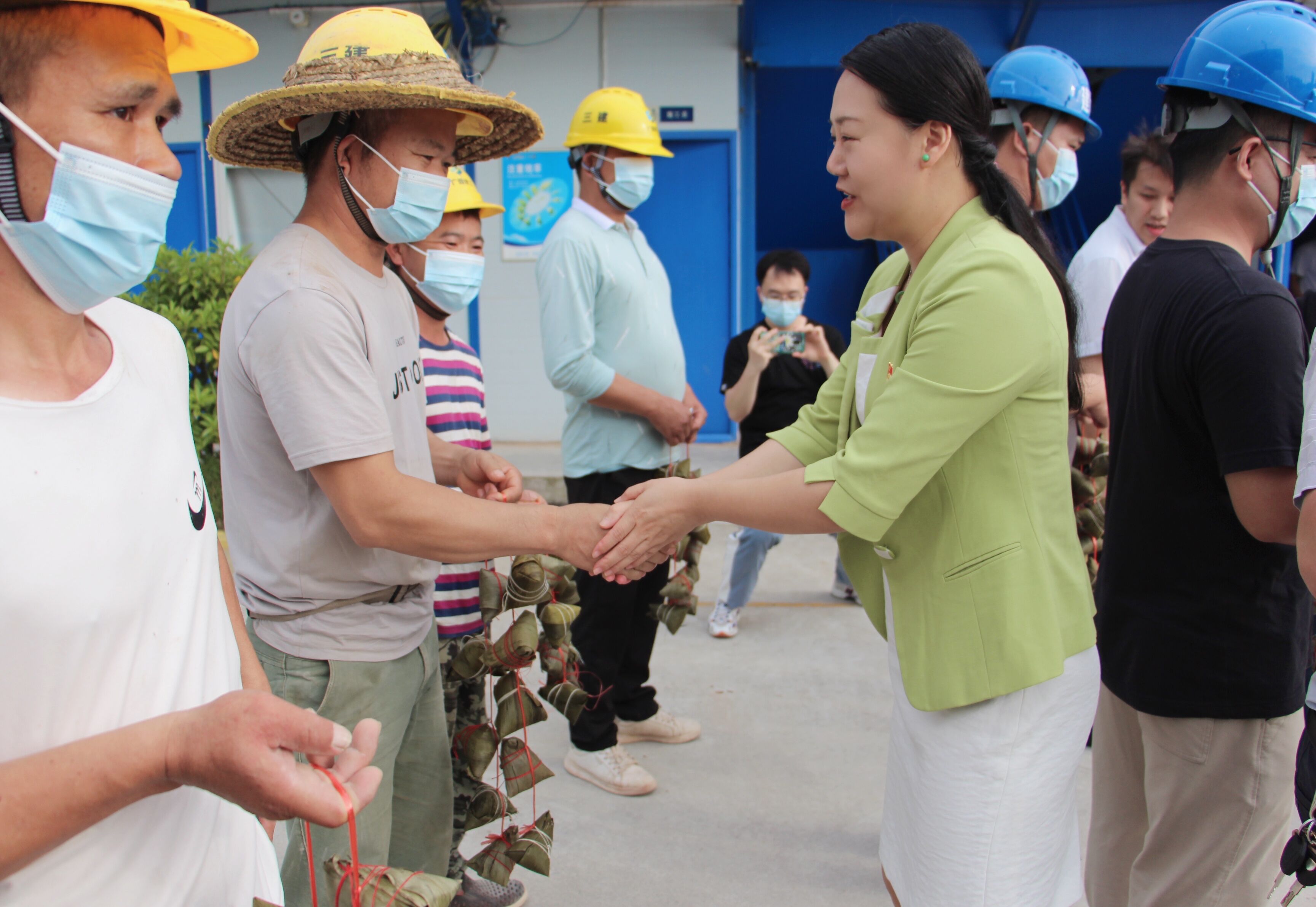 关心关怀进工地,浓浓粽情暖人心。座谈会后,此次联建的各党支部相关领导共同慰问了项目一线工人,为他们送去粽子等慰问品和最真挚的节日问候,感谢一线工人的辛勤劳动、敬业付出以及为绿港•金阳产业城等南宁市重点项目建设做出的贡献。慰问中,欧亿-中国一站式体育服务平台党委委员、副总经理黄丽琴关切地询问现场工人劳动安全保障情况和防疫情况,叮嘱大家要注意劳动安全,防疫安全,坚持安全与生产两手抓两不误,希望大家继续保持昂扬的斗志,以高度的责任感和饱满的工作热情投身到项目建设中,为经开区社会经济高质量发展作出贡献。